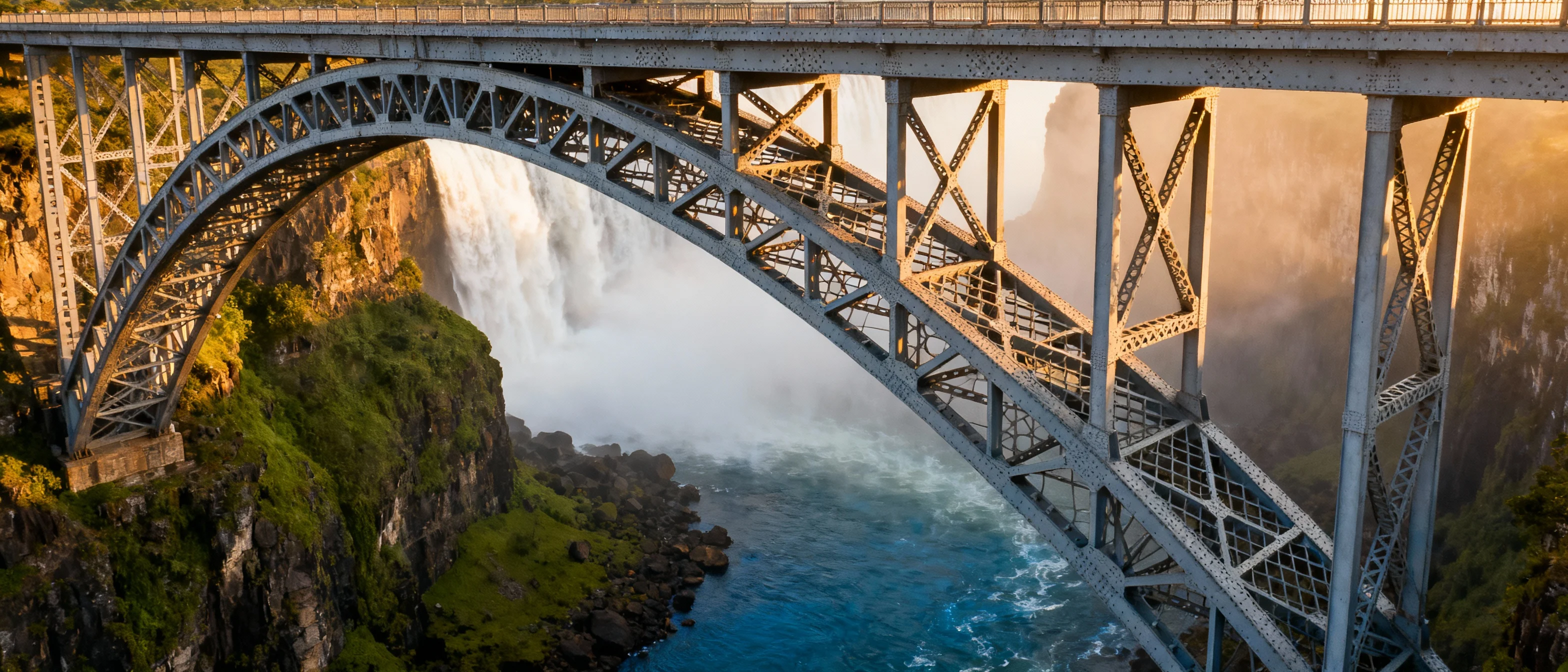 Мост водопада Виктория (Victoria Falls Bridge) — автомобильно-железнодорожно-пешеходный мост через реку Замбези на границе Замбии и Зимбабве. Находится примерно в 350 метрах южнее водопада Виктория. ![]() Однопролётный стальной мост имеет тип конструкции «параболическая арка». Общая длина (со съездами) — 198 метров, длина пролёта — 156,5 метров, высота — 128 метров. Строительство моста в 1904—1905 годах выполнила компания Cleveland Bridge & Engineering Company (главные инженеры —Джордж Эндрю Хобсон и Ральф Фримен). Мост является пограничным: он соединяет городок Виктория-Фолс (Северный Матабелеленд, Зимбабве) и город Ливингстон (Южная провинция, Замбия). Строительство моста было выполнено за 14 месяцев в 1904—1905 годах по инициативе британского политика и бизнесмена Сесиля Родса в рамках его так и не осуществлённого проекта «Железная дорога Кейптаун — Каир», несмотря на то, что он никогда не был у водопада Виктория, и умер за два года до начала строительства. Конструкции моста были изготовлены в Великобритании, затем доставлены кораблями в порт Бейра (Мозамбик), а уже оттуда по железной дороге к водопаду. Открывал мост 12 сентября 1905 года астроном и математик Джордж Говард Дарвин, сын всемирно известного Чарльза Дарвина. Стоимость строительства составила около 72 000 фунтов стерлингов. Движение по мосту неоднократно блокировалось на разные сроки в 1965—1979 годах во время войны. 26 августа 1975 года посередине моста, в поезде Transnet Freight Rail, состоялась конференция, посвящённая непризнанному государству Родезия. Она длилась 9,5 часов и не принесла никаких результатов. Во второй половине XX века мост, из-за ненадлежащего ухода, стал приходить в плачевное состояние, поэтому, в целях безопасности, максимальная нагрузка на него постоянно снижалась, дойдя в итоге до отметки в 30 тонн: более тяжёлые составы отправлялись в объезд через паром в Казунгуле или мост в Чирунду. В 2006 году мост был отремонтирован, однако максимальная нагрузка на него возросла не намного. В XXI веке на отметке 111 метров над уровнем реки (17 метров ниже полотна дороги) была обустроена площадка для бейсджампинга. В декабре 2011 года здесь из-за оборвавшегося троса сорвалась с 25-метровой высоты молодая австралийка, которую едва не съели крокодилы Замбези, но, после непродолжительных разбирательств, аттракцион закрывать не стали. Американское общество гражданских инженеров внесло этот мост в свой Список исторических достопримечательностей гражданского инженерного дела. По сей день данный мост является единственным железнодорожным сообщением между Замбией и Зимбабве, а также одним из трёх автомобильных путей сообщения между этими странами. |