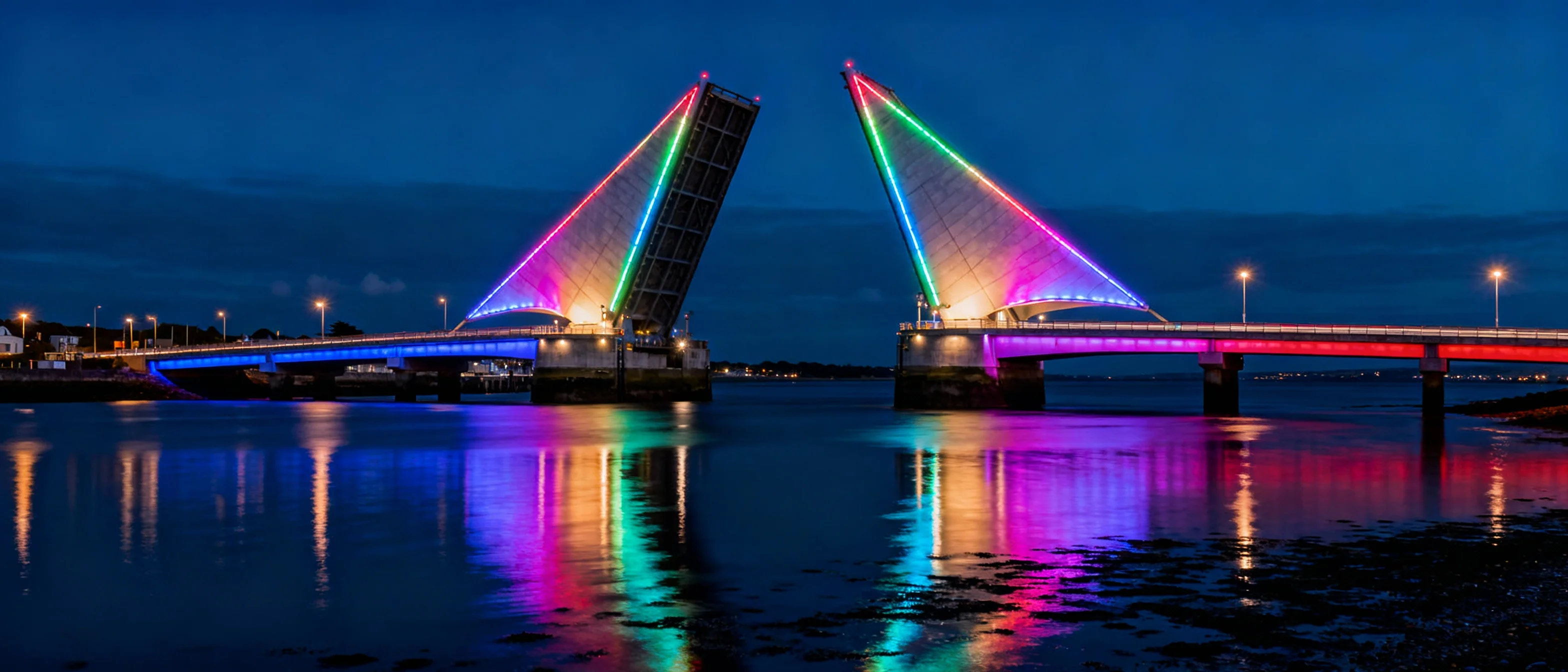 ![]() Мост The Twin Sails Bridge (также известный как The second harbour crossing) разводной мост, который располагается в заводи канала Holes Bay, соединяет центр города Пул (Poole) с Hamworthy в Англии. Существующий мост, построенный в 1927 году, не справлялся с возросшим объемом транспорта, поэтому было решено построить новый мост. План на строительство нового портового моста был принят еще в 1980х годах, но первые предложения поступили только в 2004 году. Мост The Twin Sails Bridge получил одобрение от государственного секретаря по вопросам транспорта в августе 2006 года, но начатое строительство в 2007 году было приостановлено из-за проблем cвязанных с земельным вопросом. Контракт между Советом и землевладельцами был подписан только в августе 2009 года, который позволил начать строительство в мае 2010 года, но снова было отложено до октября 2010. Проект моста разработан фирмой Wilkinson Eyre Architects. The Twin Sails Bridge является двухкрылым разводным мостом. Для пропуска судов крылья пролета открываются на 88 градусов с помощью гидроцилиндров, на высоту 35 м выше мостового полотна. Ширина судоходного канала составляет 19 м между ограждениями. Мост состоит из пяти пролетов общей длинной 139 м. Два пролета длинной по 27 м с каждой стороны и центрального раскрывающегося пролета длинной 23,4 м. Ширина проезжей части моста составляет 10,8 м для двухполосного движения, с двух сторон вдоль проезжей части расположены велосипедные дорожки шириной 2 м, ширина тротуаров для пешеходов составляет 2,5 м, которые расположены на консолях моста. Пешеходную часть моста от проезжей части отделяют волнообразные защитные экраны из нержавеющей стали, которые спроектированы в соответствии с морской темой моста и располагаются на неподвижных пролетах. Мост изготовлен из крупных частей и состоит из 41 стальной секции, которые собирались на эстакадах на набережной рядом с мостом. Пролетное строение представляет собой ортотропную плиту коробчатого сечения со стальными консолями. Толщина плиты 1,4 м. Проезжая часть дороги, за исключением подъемного пролета, усилена бетоном. Подъем крыльев пролета осуществляется двумя гидроцилиндрами, состоящие из двух отверстий 540 мм, штоков диаметром 360 мм и величиной рабочего хода 3221 мм, питание к цилиндрам осуществляется от пары агрегатов с электрическим приводом мощностью 132 кВт, которые приводят в движение гидравлические насосы. Эти гидроцилиндры были произведены уже известной по мосту Lower Hatea Crossing корпорацией Eadon. Открытие пролета на 88 градусов происходит за 90 сек. В случае отказа одного из цилиндров подъем каждого крыла может осуществляться одним цилиндром. Гидравлические механизмы располагаются в главных опорах, вместе с другим оборудованием. Twin Sails открывается 15 раз в день (5000 раз в год) в согласованной последовательности со старым мостом, расположенным выше в 350 м. Водители направляются к тому мосту, у которого открыто дорожное движение. Обычные подъемные пролеты мостов нуждаются в блокировочном замке, чтобы противостоять возможным качающимся перемещениям из одного пролета в другой. Но в данном мосте использованная конструкция с диагональным раскрытием крыльев и опускание их на шарнирные опоры на другой стороне пролета около вершины каждого треугольника, дает большую поддержку и меньшие дифференциальные перемещения, поэтому необходимость в механической блокировке отпала. При стр