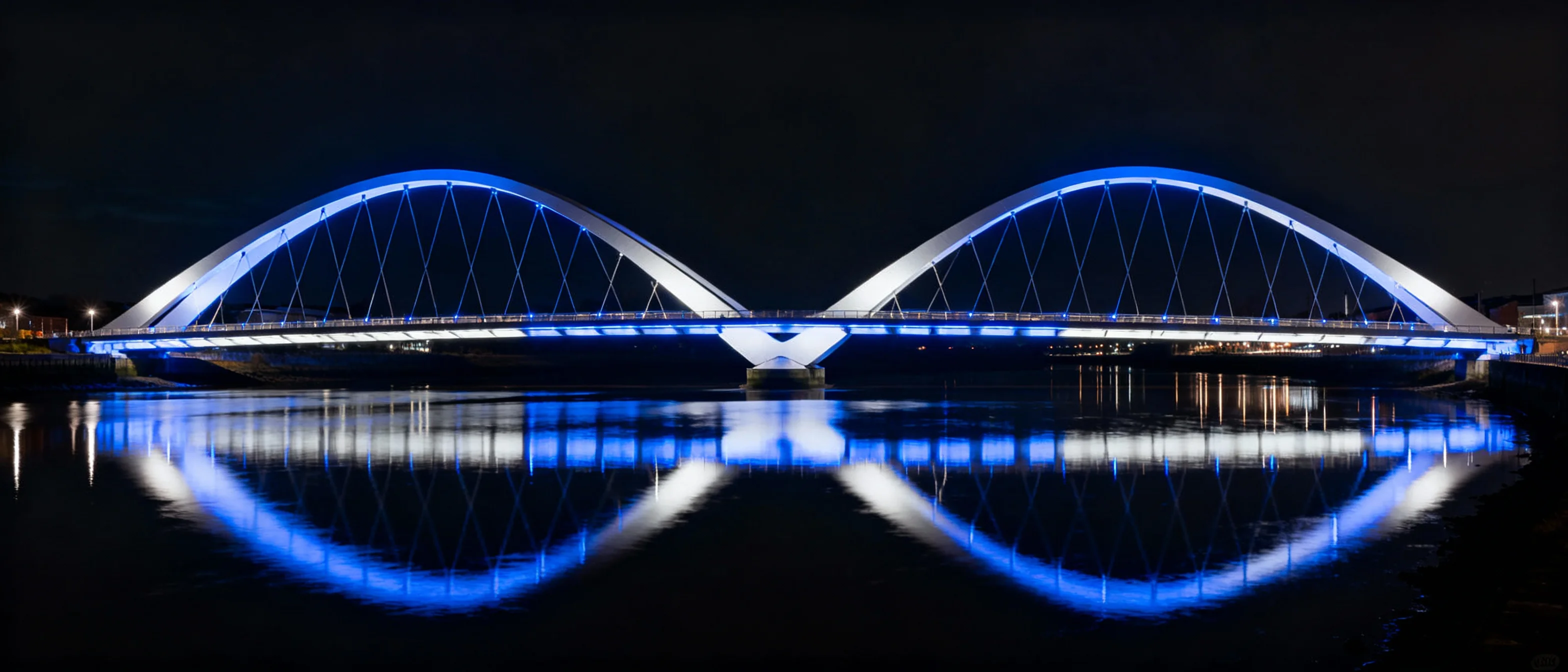 Явная часть моста и его отражение разделяет синяя линия – это пешеходная зона сооружения, оснащенная световыми элементами